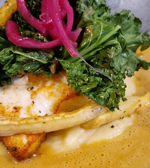 Kveite med anna-potet, sjøkrepshollandaise, smørsteikt grønnkål, persillerot og chips
